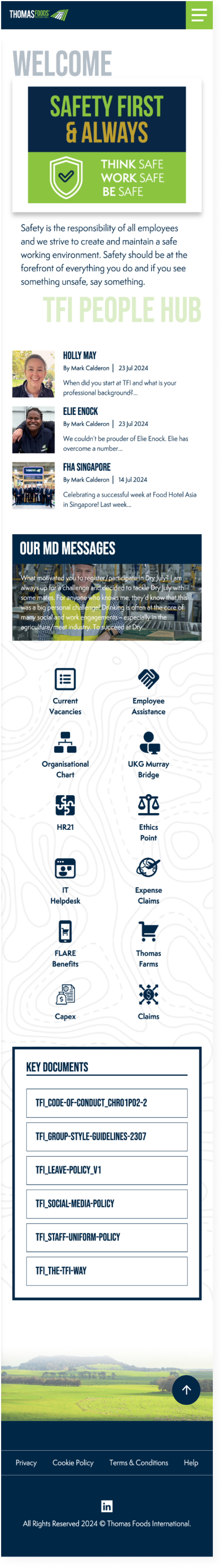情報量が多いのでシンプルで見やすい構成を意識しました。トップページにお知らせや社員のインテビュー記事を組み込むことでどんな人がどのような事業をおこなっているのかを明確にしています。また、クライアントの希望で入社時の規約などの確認ができるようにトップページから必要な書類を全てダウンロードできるようにしました。